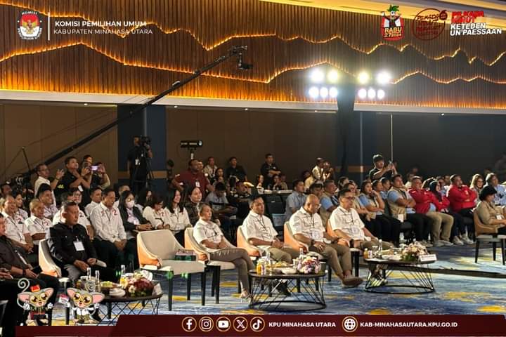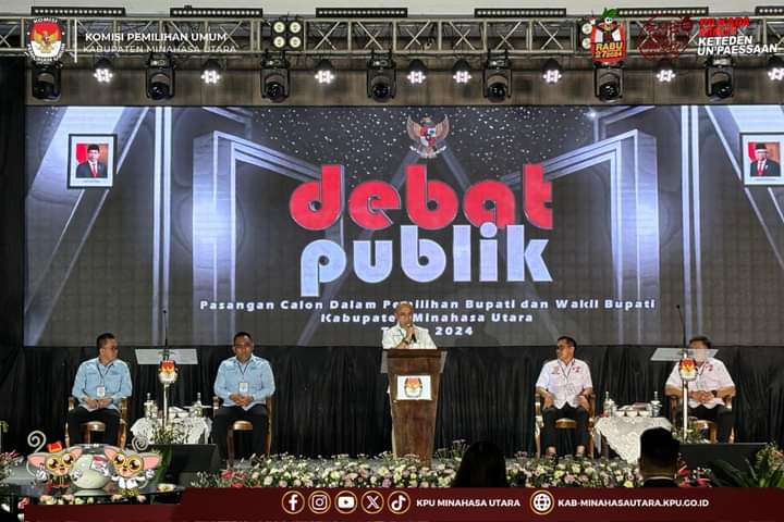 PALAKAT Minahasa Utara–Komisi Debat Publik Pertama antar Pasangan Calon Bupati dan Wakil Bupati Kabupaten Minahasa Utara Tahun 2024, digelar oleh Komisi Pemilihan Umum Kabupaten Minahasa Utara (KPU Minut),Rabu (16/10/2024), di Hotel The Sentra, Minahasa Utara.