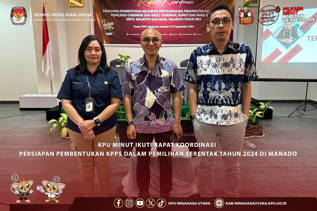 PALAKAT Manado–Ketua Komisi Pemilihan Umum Kabupaten Minahasa Utara (KPU Minut), Hendra Lumanauw, dan Ketua Divisi Sosdiklih Parmas dan SDM, Risky Pogaga bersama Kasubbag SDM, Jeane Mondoringin menghadiri Rapat Koordinasi Persiapan Pembentukan KPPS Untuk Pemilihan Gubernur dan Wakil Gubernur, Bupati dan Wakil Bupati, Walikota dan Wakil Walikota Tahun 2024 yang diselenggarakan oleh KPU Propinsi Sulawesi Utara (09—11/09/2024) di Hotel Grand Whiz, Manado.