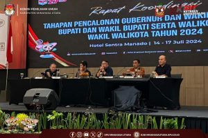 PALAKAT Minahasa Utara–Tahapan pencalonan semntara berjalan, Komisi Pemilihan Umum Kabupaten Minahasa Utara (KPU Minut) dalam upaya menyamakan pemahaman terhadap proses tahapan tersebut, mengikuti Rapat Koordinasi pada 14-17 Juli 2024 bertempat di The Sentra Hotel Manado.